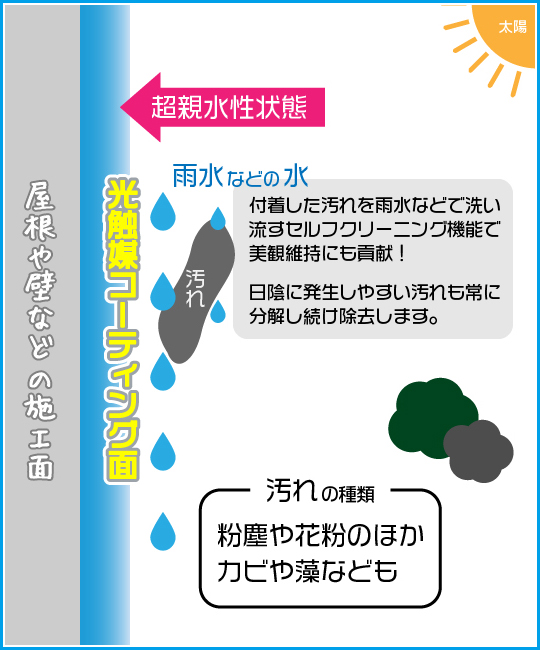 セルフクリーニング機能とは、コーティング面の超親水性(撥水性の逆)状態が汚れを落ちやすくするという性質を利用したもので付着した汚れを雨水で洗い流すことができるという機能で、塗装を長持ちさせるメリットがあります。