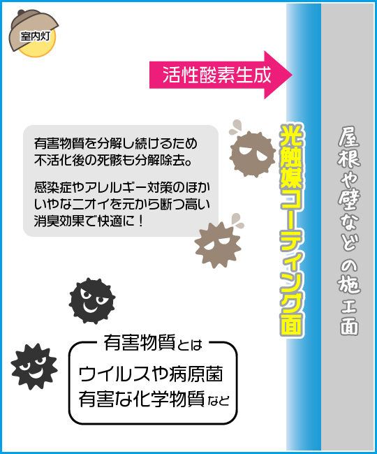 屋内用で使用している光触媒材においても同じく不純物を含まない可視光応答型光触を使用していますが、屋外のように雨風や強い紫外線にさらされることが無く、限られた室内空間での使用であることから保護用コーティングなしでも施工できるよう開発された室内用光触媒材を使用しています。